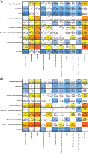 (A)无进展生存风险比。(B)基于分数多项式网络荟萃分析(带锚定)的平均无进展生存期的差异。